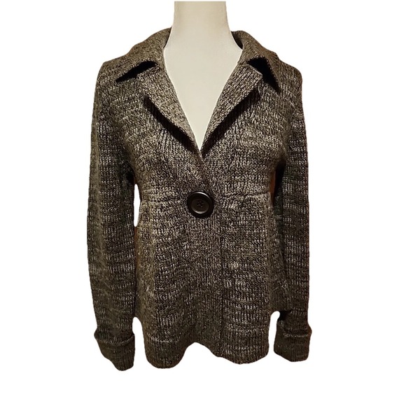Kenji Peplum Cardigan Classic Feminine Gray Heather Button Tab Sweater Womens Sz L