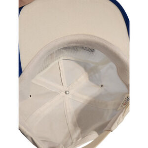 Show your love for space exploration with this Kennedy Space Center hat featuring the iconic Spaceport USA logo. The cap boasts a classic white crown with blue and red accents, including a blue button on top, blue piping on the visor, and a striking red braided rope detail above the brim.