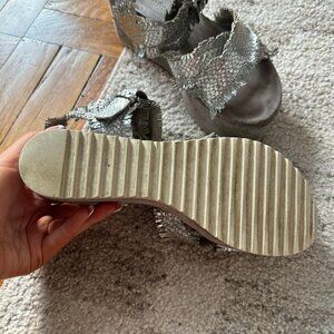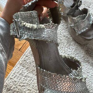 Statement platform sandals by Kennel & Schmenger, handcrafted in Germany. Features metallic silver snakeskin-textured straps with raw-edge detailing and oversized buckle closures. Soft suede platform base adds height while keeping them ultra-comfortable. A bold mix of glam and grunge—perfect for edgy street style or elevated festival looks.
