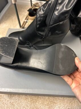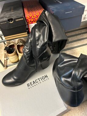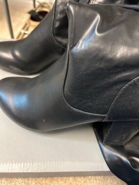 Classic black mid-calf boots with a sturdy block heel. Smooth synthetic upper with side zipper closure. Sleek rounded toe and fitted shaft for easy styling.