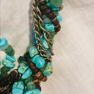 Beautiful Kenneth Cole multi-strand Statement Necklace. The eight strand design is a complementary mix of turquoise, aventurine, brown shells, silver metal chain and a Kenneth Cole New York signature hang tag. Necklace is 24” long. EUC.
