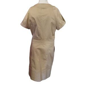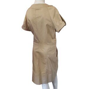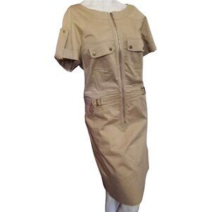 This is an adorable Kenneth Cole Aviator Dress. This dress is beige with a Zipper front, cute buckles embellishments at each side, cuffed sleeves, and four pockets total, two at the hips and two in the bust. It is a fitted, knee-high style aviator cargo dress.
