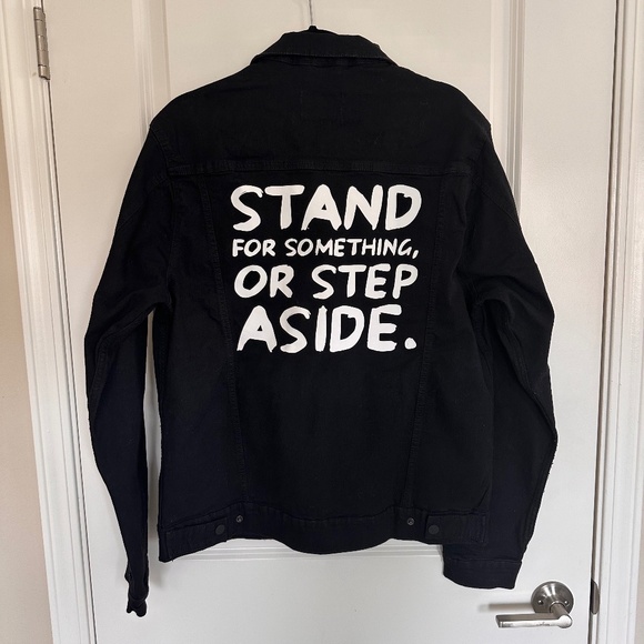 Black Denim/Jean Jacket with Graffiti Style Writing on Back "Stand For Something, Or Step Aside". Limited edition jacket, designed in New York, and made from recycled materials.