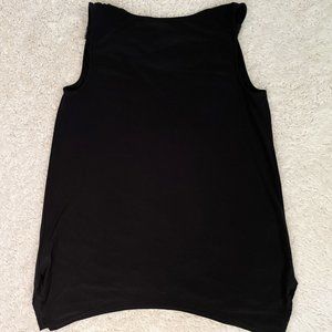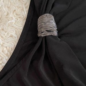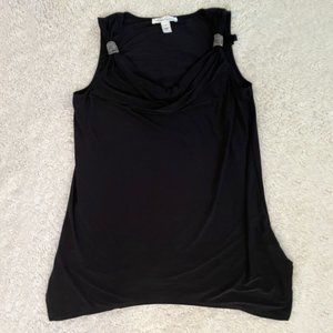 This flowy sleeveless top features a draped collar, gathered detail in silver on with straps, and shirt tail hem. Excellent pre-owned condition with no rips, snags, or stains. 95%Polyester 5% Spandex