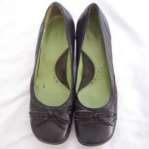 Cute heels with bow design. Leather upper. Wear can be seen on the leather on the front and back of shoes as seen in photos 2, 3, 4 and on the right heel in photos 4 and 7. There are some minor scuffs/tears on the inside of the shoe where the toes touch the leather. These can easily be restored by a cobbler. Reasonable offers considered. Smoke free home.