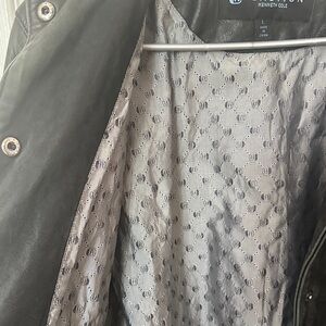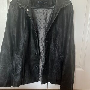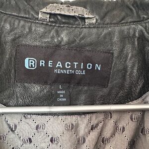 Stylish black leather jacket by Kenneth Cole. Perfect for versatile wear. Classic design with a modern touch. Has some wears on the sleeves and edges
