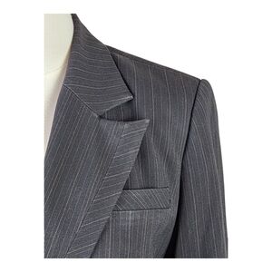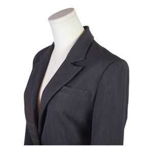 Elevate your professional wardrobe with this sleek Kenneth Cole New York pinstripe blazer in size 2 (UK 6), tailored to perfection for a polished, modern fit. Crafted from a high-quality blend of polyester, viscose, and spandex, this structured jacket offers just the right amount of stretch for all-day comfort while maintaining a sharp silhouette. The classic black fabric is accented with subtle gray pinstripes, giving it a timeless, boardroom-ready appeal.