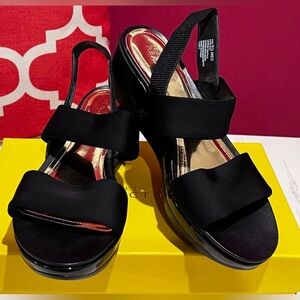 Kenneth Cole - “Pepe Pot Ne” stylish black platform sandals with a sateen fabric finish. Comfortable footbed and wedge heel for perfect for everyday versatile wear. Great condition!