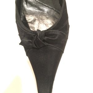 You will not find any other shoe like this one on Poshmark or in the stores! They have only been worn inside (to show them off ) and have never been worn "for real" outside of my house. They are gorgeous and actually super comfortable because of the flexible sole. All satin, with a tight bow and subtle detail, and low, sexy heel. The long tapered, squared-off toe extends beyond your toes and is super sexy ON. Not witchy, but bewitching! Excellent condition!