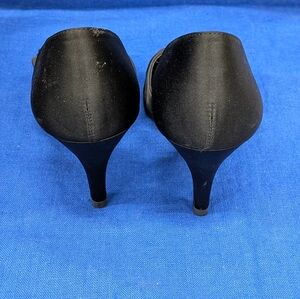 Chic black satin heels with open-toe design. Rhinestone detail adds sparkle. Ideal for elegant events.