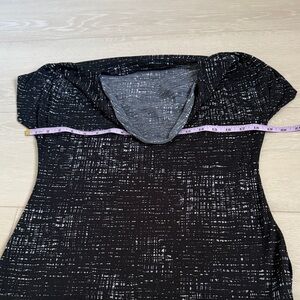 Stylish black blouse with white textured pattern. Features a draped cowl neckline. Ideal for versatile wear.