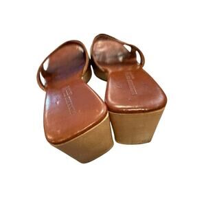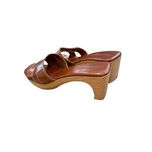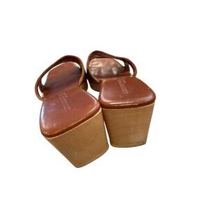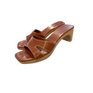 Kenneth Cole Brown Leather Heeled Sandals Square Toe Slip On Wood Band Stand 8.5