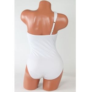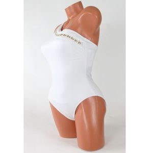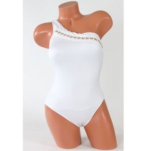 A glam look accented with a gold-tone chain, this sophisticated one-piece from Kenneth Cole Reaction features a chic one-shoulder silhouette. Tummy control helps keep your lines smooth.