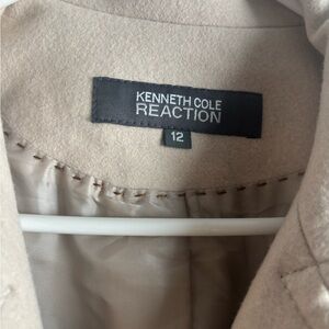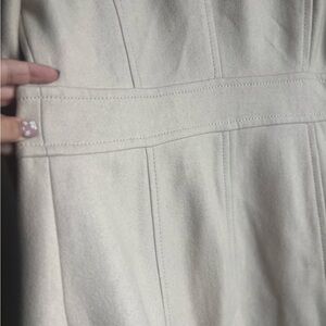 Chic cream trench coat with button accents. Features front pockets and a tailored fit. Ideal for stylish layering.