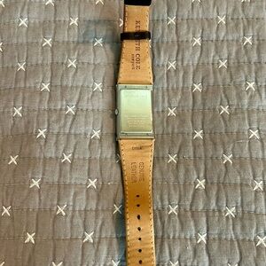 Dark brown leather strap with silver buckle. Classic and versatile.