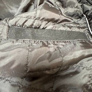 ~~ Sharp and Chic Doubled Breasted Button/Zip Closure, Quilted Lining Pattern for Extra Warmth, Inner Rib Knit Bib, Notched Lapel Collar, Collared Neck, Open Front Pockets, Interior Pocket. This Coat is NEW with TAGS Missing/Removed. The Spare Button is still wrapped and attached as noted in photographs. This is a stylish and fashion forward coat!!