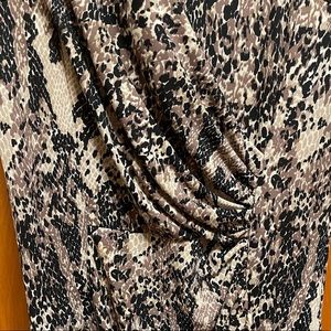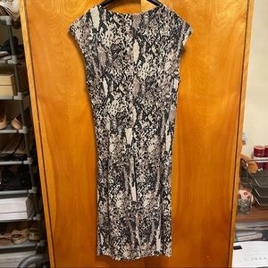 Super flattering dress (polyester with 5% spandex) with discrete slit in front. Machine Wash Cold.