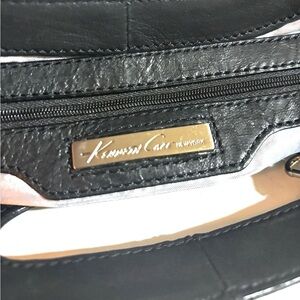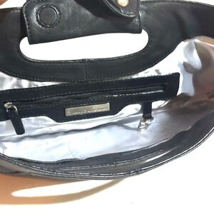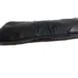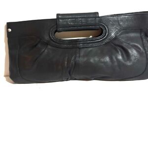 This stylish black leather clutch is perfect for any occasion. Its sleek design and high-quality material make it a must-have accessory.main compartment 3 compartment 1 zip pocket closure lining have minor stains hight 5” wide 15.5” depth 1.5”