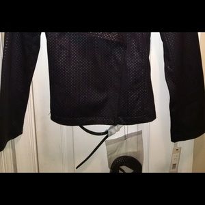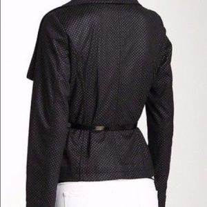 ❤️ A dramatic collar caps a perforated vegan suede jacket that's styled with a removable waist belt.