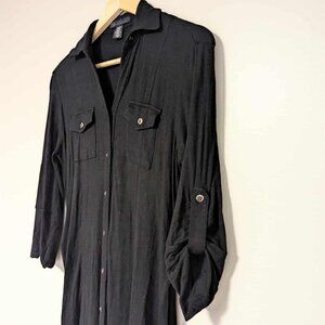 Soft t-shirt material. Buttons all the way down. Tie belt. Buttons on sleeves to adjust length. Great condition. No flaws.