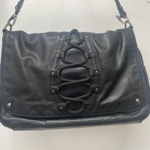 Black genuine leather. Lace up detail with silver studs and silver studdedstrap. Strap is removable. Magnetic foldover closure. Zip pocket out the outside. Inside has zip pocket, 2 slip pockets and a key clip.
