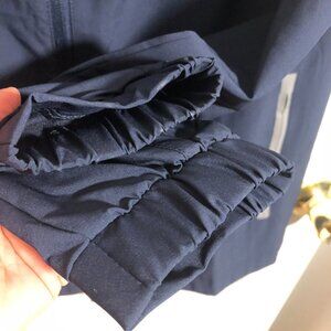 Kenneth Cole Golf Men Navy jacket reflective poly stretch windbreaker, 2 zipped side pockets, full front zip, Style KZ9K67NAVP8, Size M MSRP$79, measures approximately when laying flat: shoulder edge to shoulder edge 24", armpit to armpit 22", length at back 30"