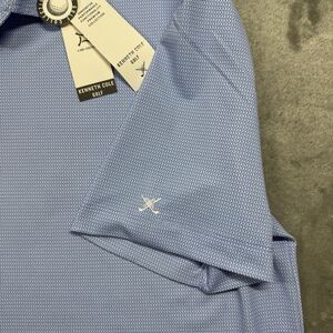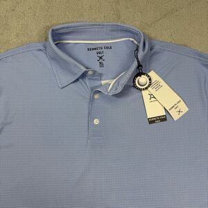The Kenneth Cole Golf Polo in Men's XL is a stylish and functional piece designed for the avid golfer. Made of blue polyester with a geometric pattern, this short sleeve polo features a collared neckline and light fabric wash. The stretch performance material offers flexibility and comfort, perfect for active movements on the golf course. With a classic designer touch and a focus on both style and functionality, this polo is a versatile addition to any man's wardrobe.