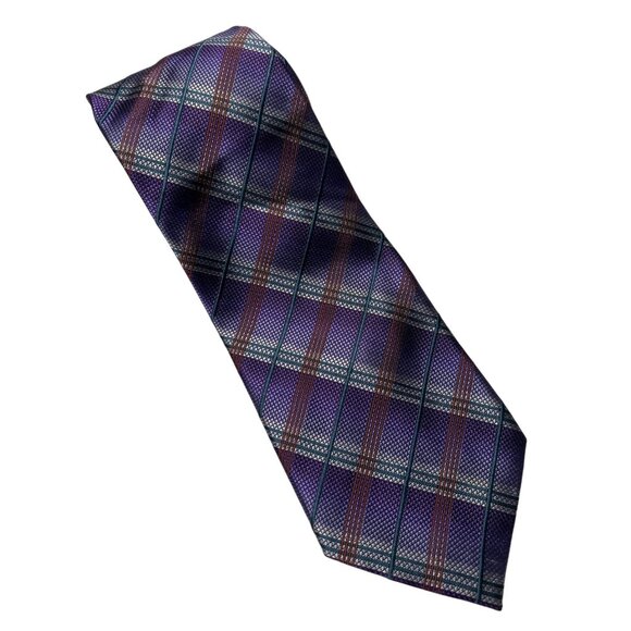 Elegant silk tie featuring a bold purple base with silver, burgundy, and teal plaid accents, perfect for adding refined style to formal attire.
