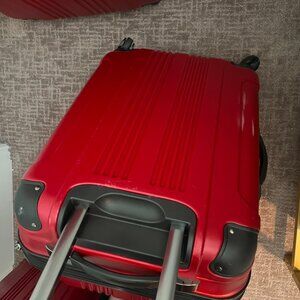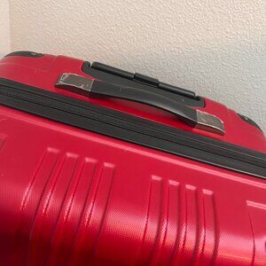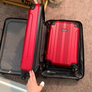 Only used once - had been stored in the original packaging otherwise, but I did not use it enough. Lightweight Hardshell 4-wheel spinner luggage scarlet red 3-piece set, 20", 24", and 28". They have molded corner guards for extra protection, tear-resistant polyester lining, dual-sided packing, compression straps, a hanging zipper pocket, a telescoping trolley handle, and 360-degree wheel spinners to provide smooth and quiet handling. Originally about $300.