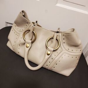 preowned pebbled leather satchel with gorgous brass rings and studs