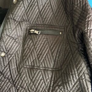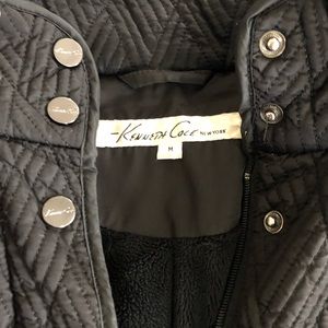 Kenneth Cole quilted black zippered jacket in medium. Has 4 pockets: 2 zippered and 2 snap closures. Silver snap accents. Length hits at waist. In good condition.