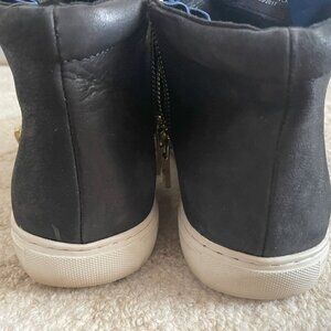 These are great versatile cute bootie/sneaker. Comfy and stylish (and warm). The leather is weather resistant. Side zippers are easy in/out whether you are wearing socks, tights or peds. The insets for the zipper are accented in a royal blue suede which you can not see when zippered but make shoes feel a little Lux! Gently worn, clean and in Very Good condition.