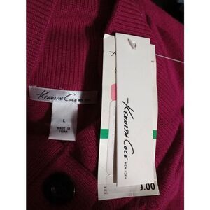 This is a beautiful new with tags Kenneth Cole pink long sleeve cardigan sweater. It is size L and made of 65% acrylic, 20% nylon, and 15% wool. It has a classic fit and is perfect for layering on a chilly day.