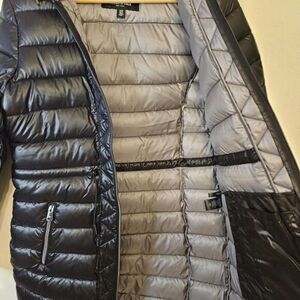 This is a Kenneth Cole Quilted Anorak Jacket for women in size Small. The jacket is made of polyester with a solid black color and a mid-length design. It features long sleeves, a hood, and a zipper closure. The lining is also made of polyester, and it has quilted accents for added style. Ideal for staying warm and stylish in cooler weather.