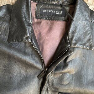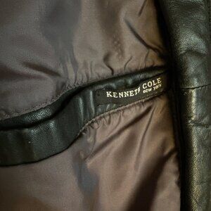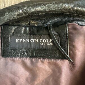 This Kenneth Cole leather jacket is a stylish addition to any wardrobe. Made with soft lambs leather, it has a classic black color and a vintage 90s Y2K style. The jacket features a zip closure, making it easy to wear and providing a secure fit.