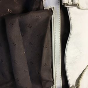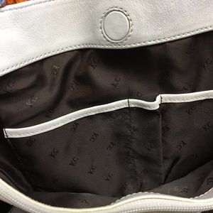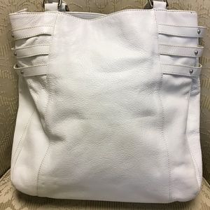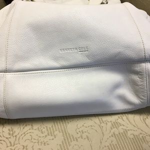 Kenneth Cole NY Large Shoulder Bag: Gently used. All white small pebble grain leather exterior with brushed nickel plate hardware. KC logo lining in dark brown w/large middle zippered compartment w/room on either side containing smaller zip pocket and 2 other interior pockets. Magnetic snap, minor wear mostly on handles where the edge paint is cracked. Well made, GC, NS, No pets.