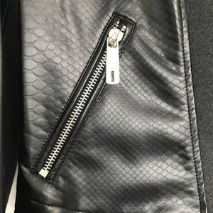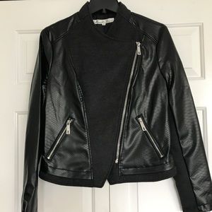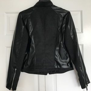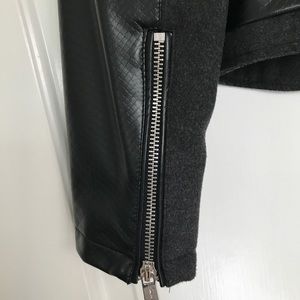 Sharp looking black (faux) leather moto jacket with gray wool detailing and trim. Lots of fun zippers! Excellent condition. Worn only once!