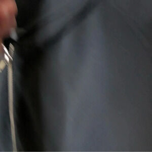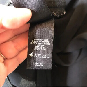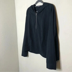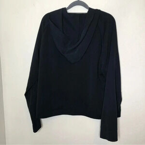 Love this unique take on a pullover hoodie. Material is black polyester and is thin. So it wears much more like a blouse than a hoodie. Very cute! In good used condition.