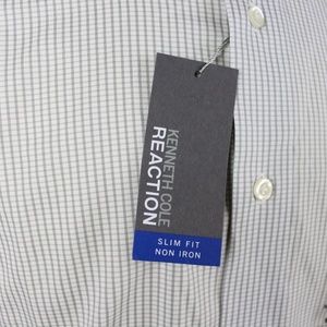 Kenneth Cole Men's Reaction Non Iron Slim Fit Dress Shirt White Grey Micro Tattersall Check Pattern 15-15.5 34/35