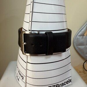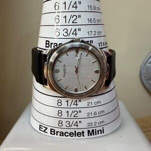 A stylish men's watch featuring a sleek silver face and black leather strap. The analog design includes a convenient date display for practicality.