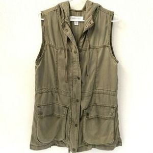 Kenneth Cole Reaction Green Hooded Sleeveless Jacket. Army green military style hooded vest has a stylish relaxed vibe! Features a zip front, side pockets. Drawstring waist and hood. Soft fabric. A perfect layering piece for fall! It is missing a button, but you can't tell while wearing it.