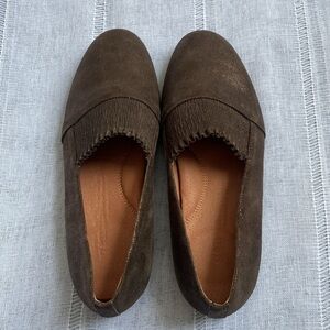 These Kenneth Cole flats from his Gentle Soles collection are a classic and comfortable choice. They’re made of leather and slip on easily. They have an almond toe and a stunning metallic brown color. They’re a great shoe for both skirts and jeans and come in size 6.