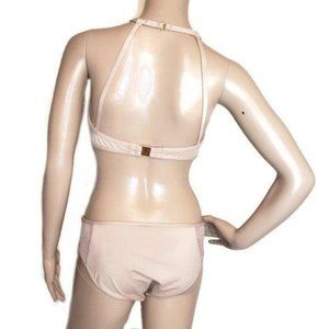Kenneth Cole NWT nude bikini size small crocheted high neckline top. The sides are mesh. The color is a nude tan cream color. The back has a nice quality gold hook. The straps are adjustable and the padding is removable.