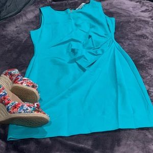 A classy figure flattering shape with ruched gathering on one side of the dress. The back features a fully exposed back zipper with dual pulls, contrast trim and pipping. Excellent condition, no tags but never worn. Suze 10, Teal is the color.