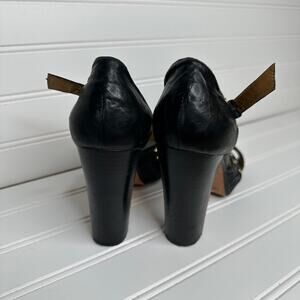 Kenneth Cole New York all leather black strappy block heels brass studs buckle