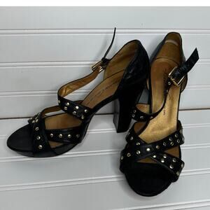 Kenneth Cole NY genuine leather black strappy heels studs buckle gold