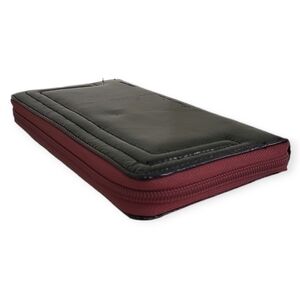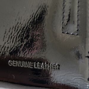 Kenneth Cole New York black patent leather zip around wallet with burgundy trim. Features include an interior snap pocket, 10 card slots, 4 slip pockets for cash/checks/misc, and 1 zip pocket. Measurements are 4" x 8" x 0.5". The last photo shows wear on the interior snap pocket.