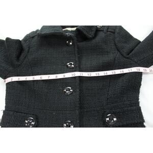 Kenneth Cole New York women’s long black coat in size 6. Made in El Salvador, this elegant coat features a double-breasted button closure, a collared neckline, and a fully lined interior for comfort. Constructed from a textured wool blend fabric with acrylic and polyester for durability. Professionally dry clean only.