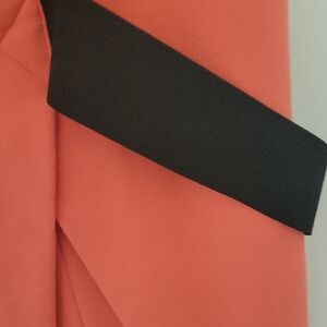 Chic coral midi dress with a stylish wrap design. Features a bold black accent for added flair.
