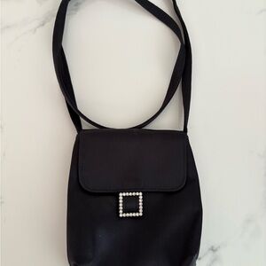 Chic black crossbody with pearl buckle detail. Perfect for any occasion.